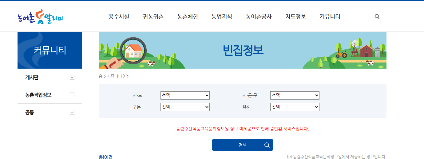 농촌 알리미에서 접속 후 빈집정보에서 지역 선택, 유형 선택 후 검색하면 다양한 빈집정보를 바로 확인할 수 있습니다.