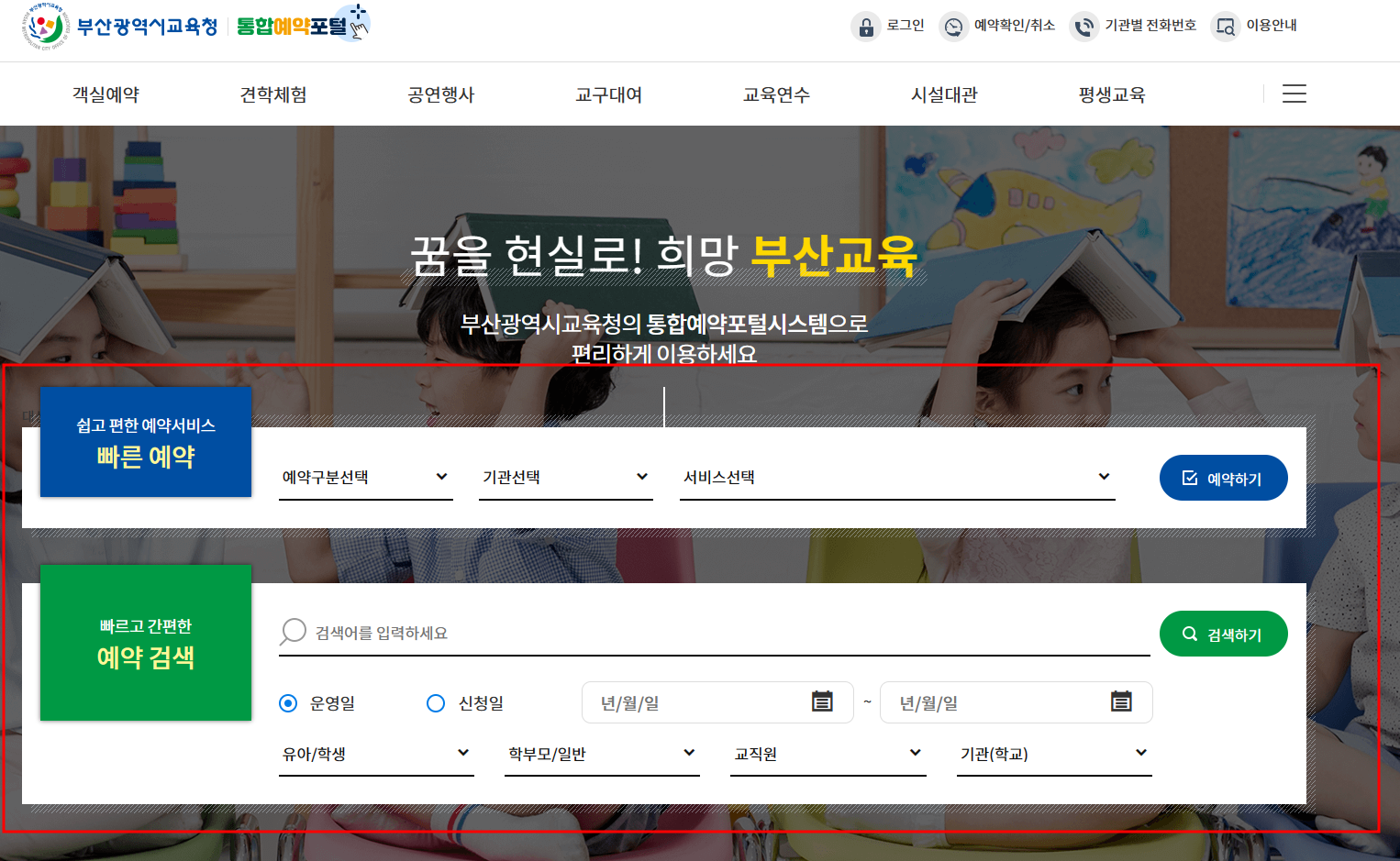 부산광역시교육청 통합예약포털 홈페이지