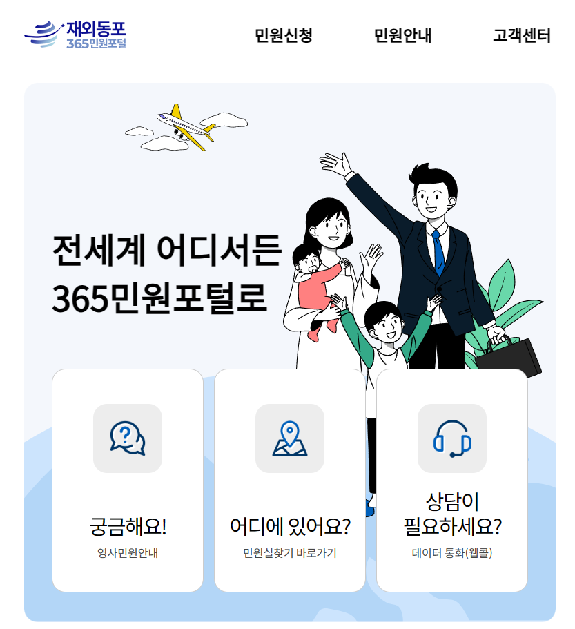 재외동포 365민원포털 홈페이지 바로가기 정보입니다. 이 사이트에서는 재외국민등록 신청 및 온라인 여권 재발급 신청, 여권 분실신고, 민원신청 등 다양한 서비스를 이용할 수 있는 곳입니다.