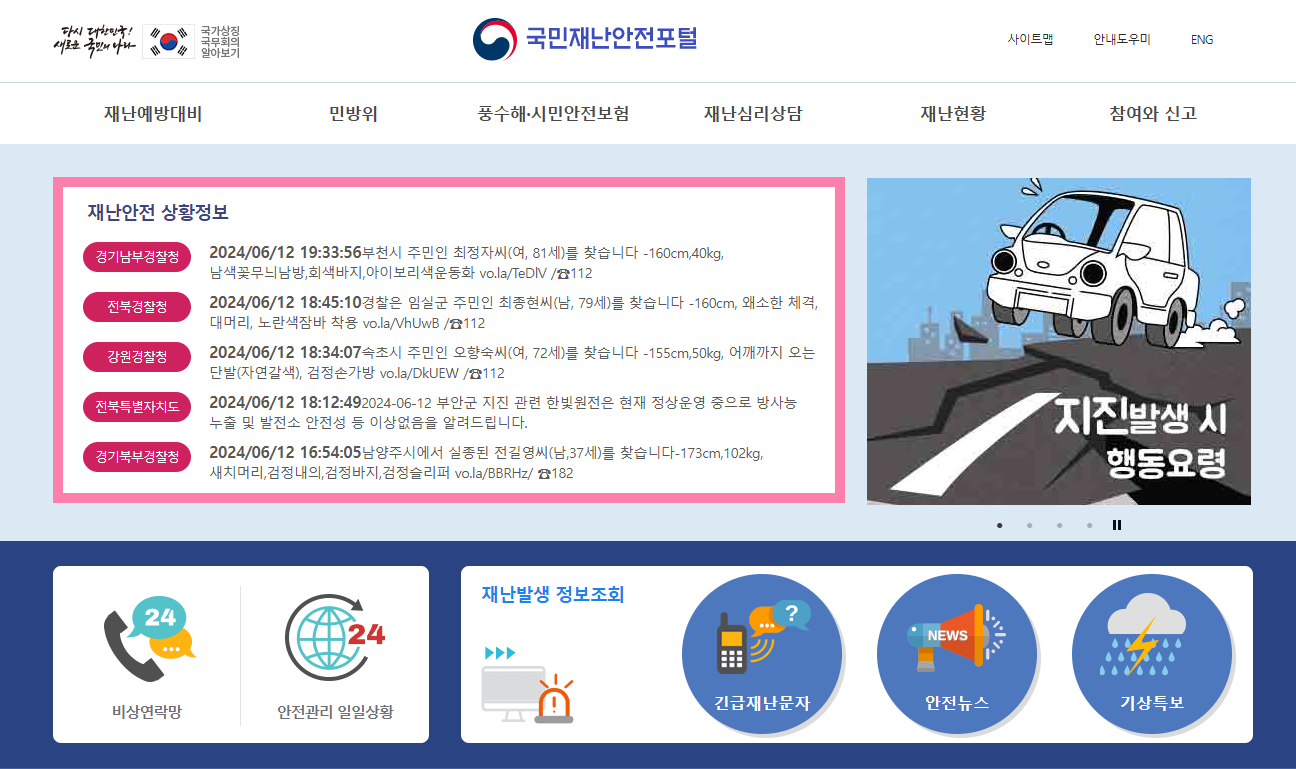 국민재난안전포털 홈페이지 바로가기 주소는 (safekorea.go.kr)입니다. 이곳에서 다양한 재난예방대비에 대해서 확인 및 교육 자료를 받을 수 있습니다.