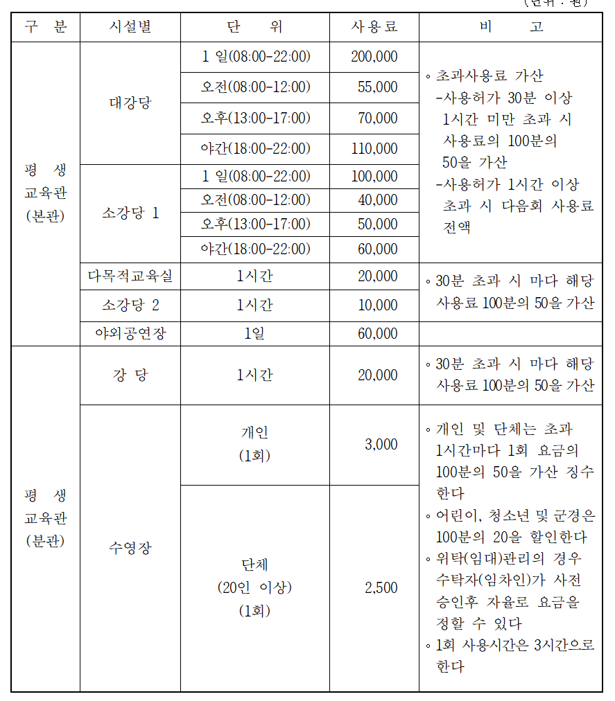 대관신청은 무료가 아니며, 시설별 마다 사용료는 다릅니다.