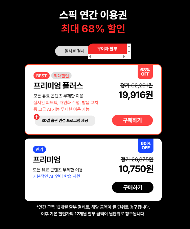 그럼 어떻게 저렴하게 이용할 수 있을까요? 그건 바로 할인코드를 적용하는 것입니다. 스픽은 정기적으로 다양한 프로모션을 진행하며, 특정 기간 동안 신규 및 기존 회원을 대상으로 할인 혜택을 제공합니다.