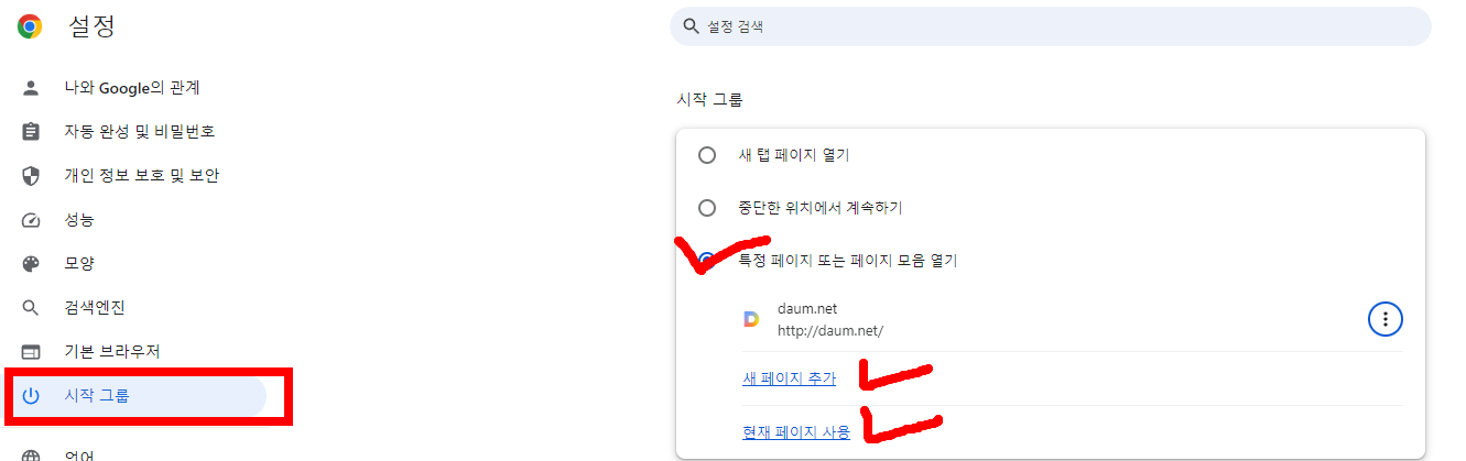 - "시작그룹"에서 "특정 페이지 또는 페이지 모음 열기 (선태 사항)