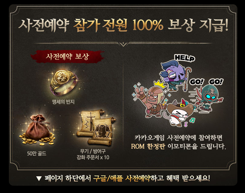 사전예약 보상으로 맹세의 반지, 50만 골드, 무기/방어구 강화주문서 X10와 ROM 한정판 이모티콘을 드립니다.