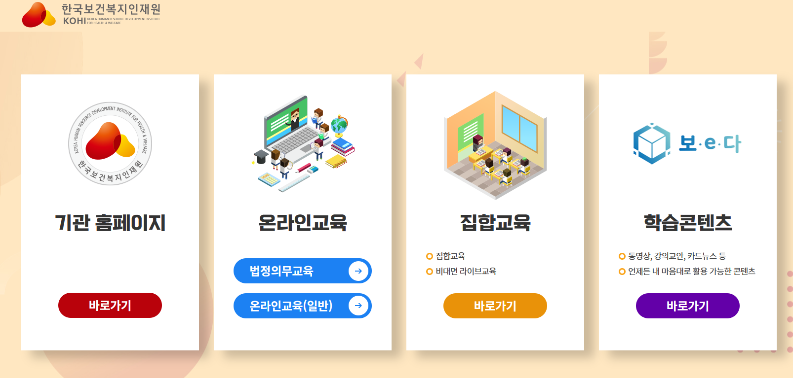 한국복지보건인력개발원 사이버교육 홈페이지 주소는 (kohi.or.kr)입니다. 이곳에서는 온라인 법정의무 교육, 온라인교육(일반), 집합교육, 비대면 라이브교육, 학습콘텐츠(동영상, 강의교안, 카드뉴스 등) 다양한 교육과 콘텐츠가 있습니다.