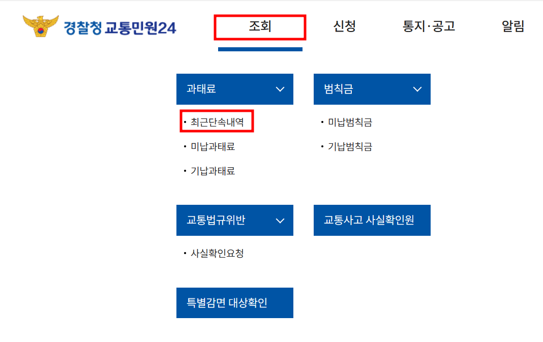 - 홈페이지 중앙 왼쪽 자주 찾는 메뉴에서 "최근단속내역" > 간편 인증 로그인 후 조회