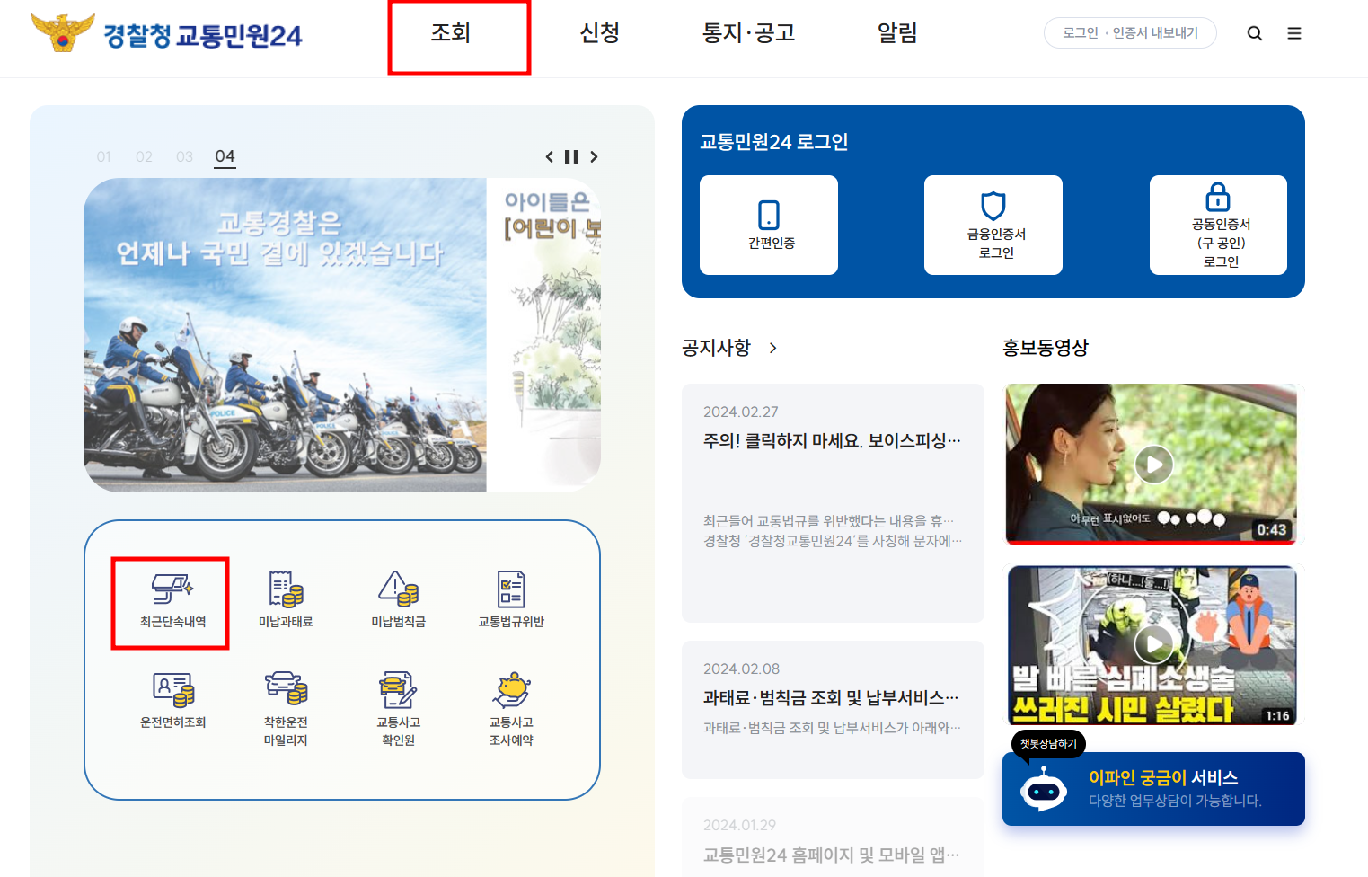 - 홈페이지 상단 "조회" > "최근단속내역" > 간편인증 로그인 후 조회