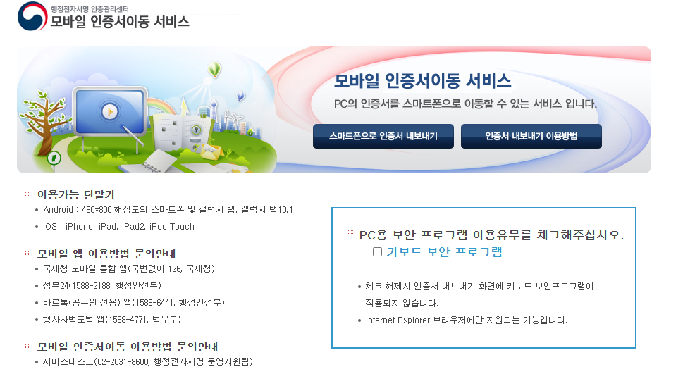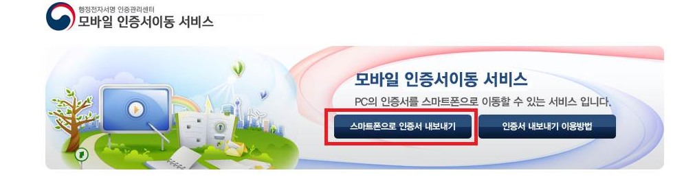 모바일 인증서이동 서비스 홈페이지