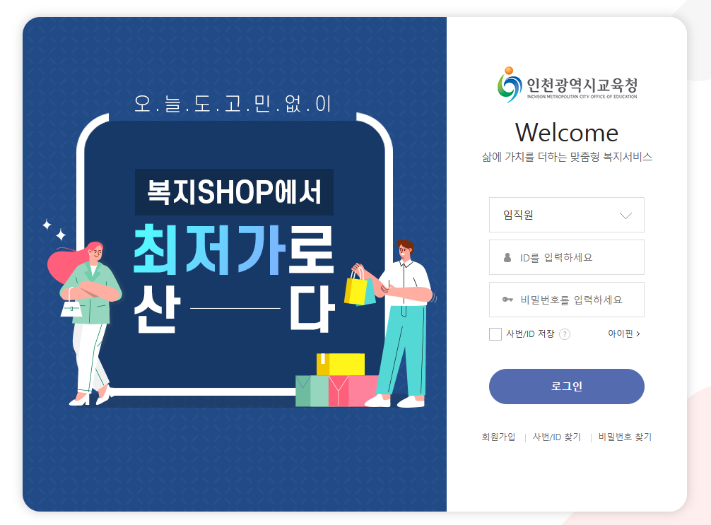 인천광역시 교직원 후생복지관 홈페이지 바로가기 주소는 (ezwel.com)입니다. 복지샵을 통해 최저가로 다양한 상품, 숙박, 문화, 여행, 건강, 자기 계발 등 이용할 수 있습니다.