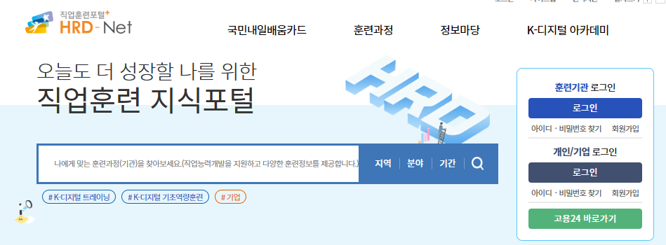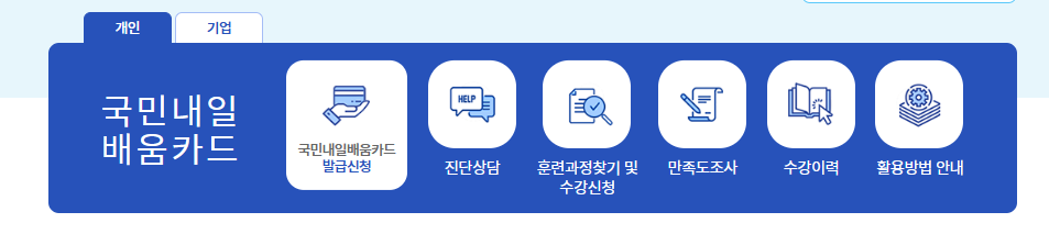 - 개인의 직업능력 개발을 위한 정부 지원 프로그램으로, 다양한 훈련과정에 대한 정보 및 수강 신청 시 훈련비용을 지원받을 수 있습니다.